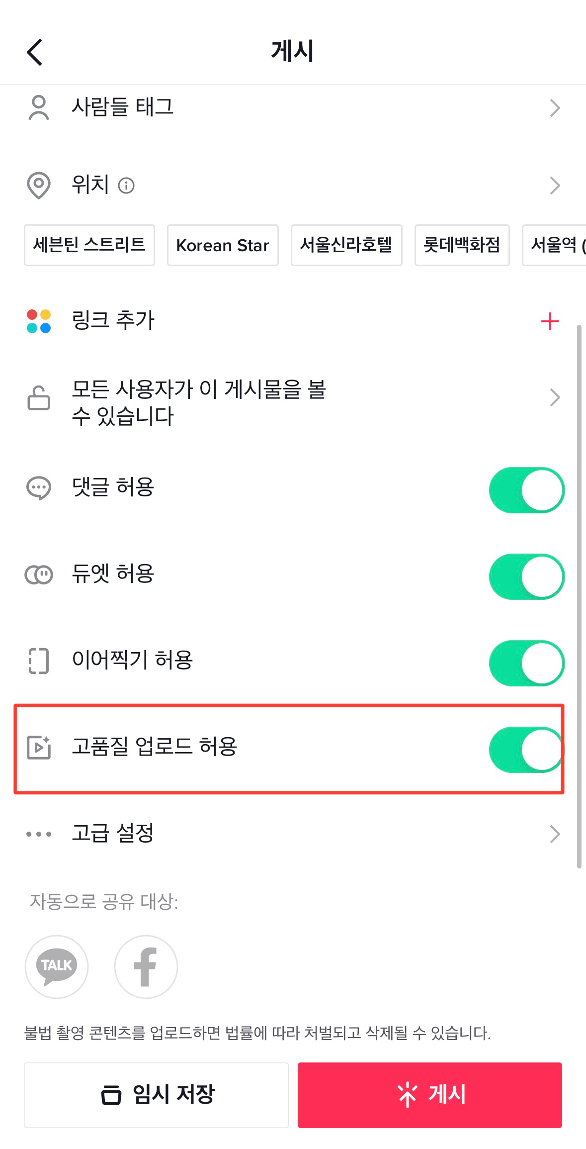 틱톡에 업로드할 영상을 선택한 후 마지막 단계에서 설정할 수 있습니다. 아래로 스크롤하면 [고품질 업로드 허용]을 선택하면 고화질로 영상이 올라가게 됩니다.