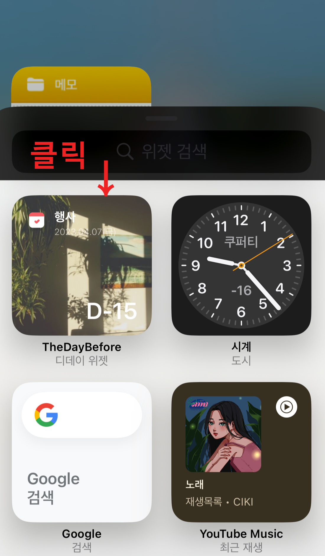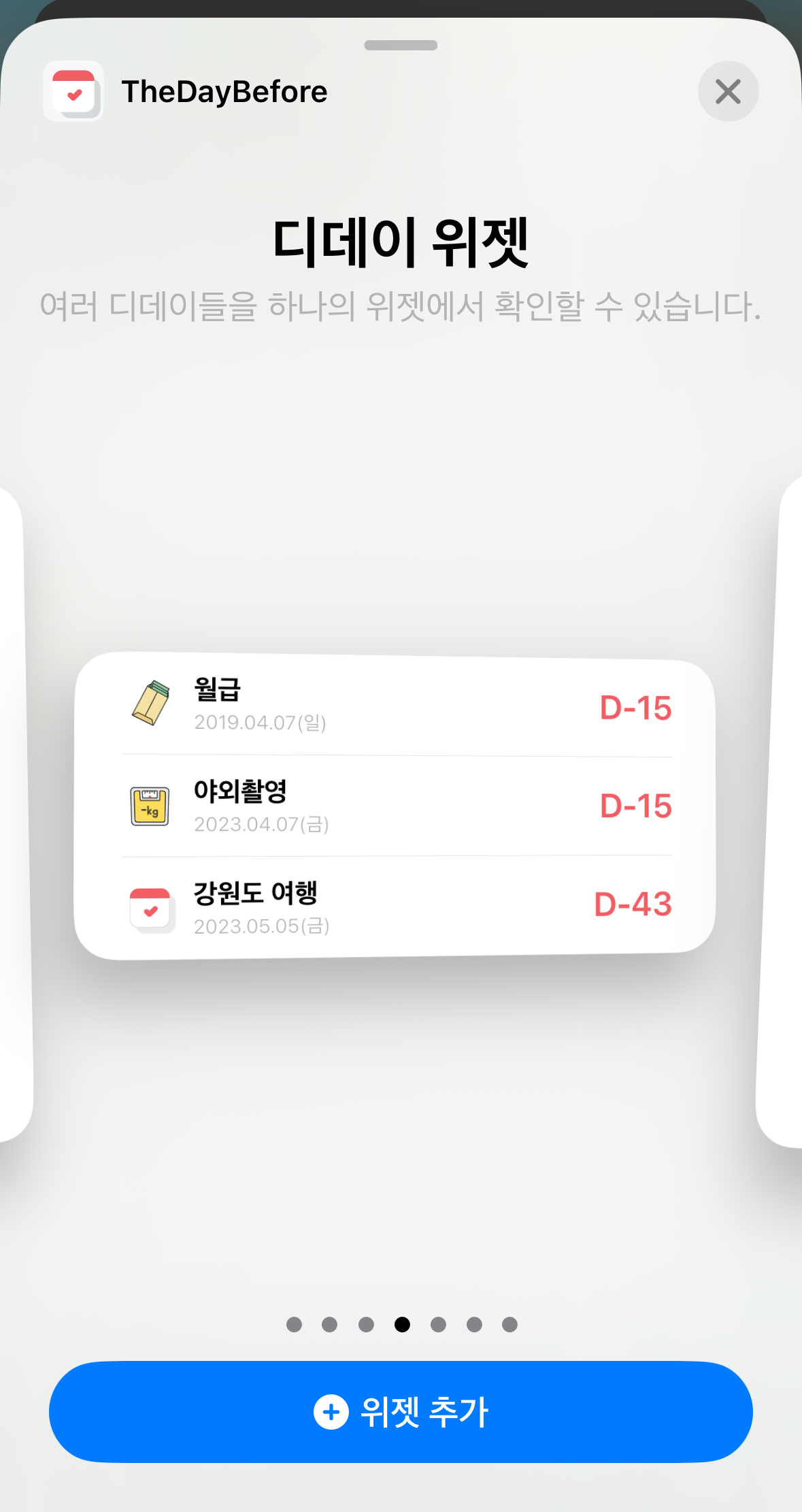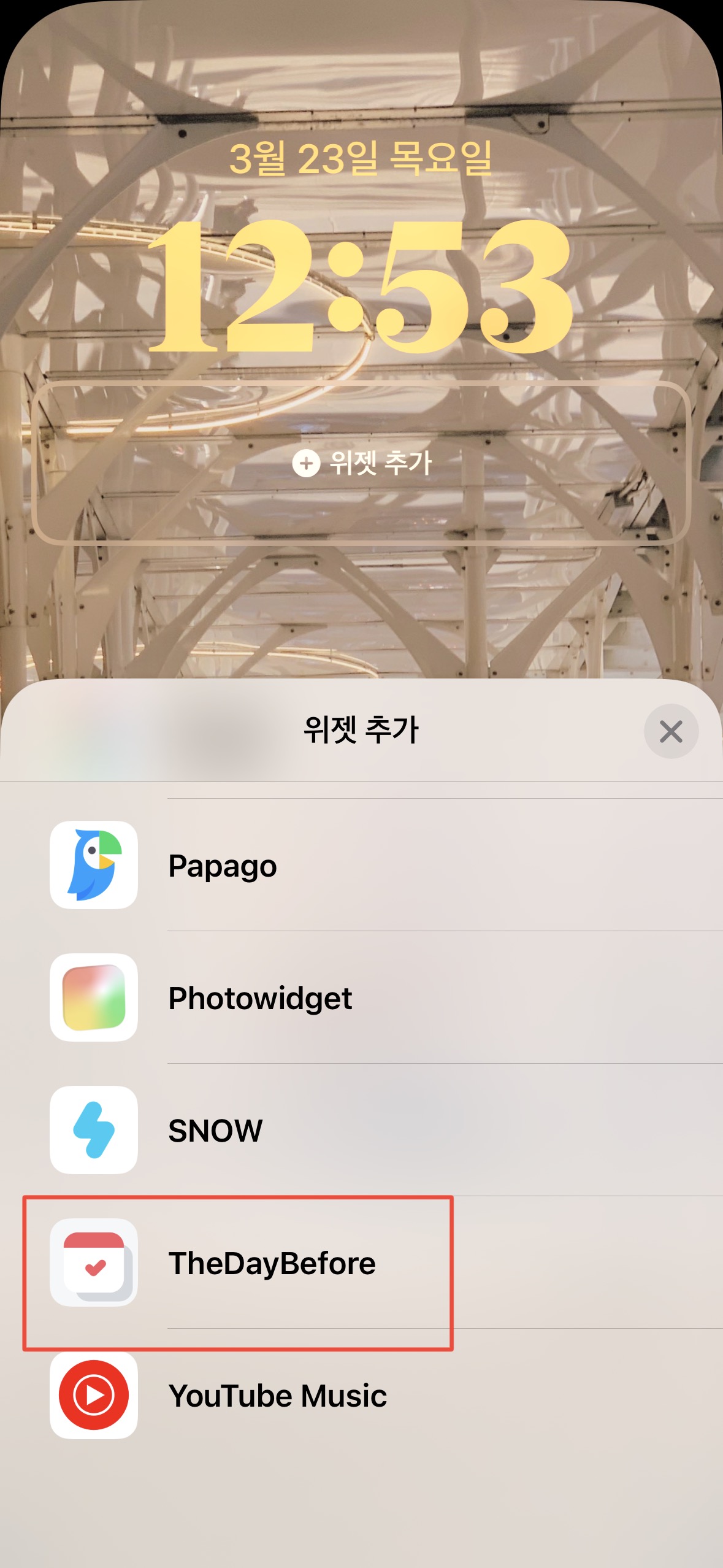 아래로 스크롤하여 TheDayBefore 위젯을 선택합니다. 사용자의 취향에 맞게 디데이 위젯 크기와 형태를 선택할 수 있습니다. 저는 디데이 리스트가 적힌 위젯을 선택했습니다. 아래 위젯추가를 눌러주면 위젯이 생성됩니다.