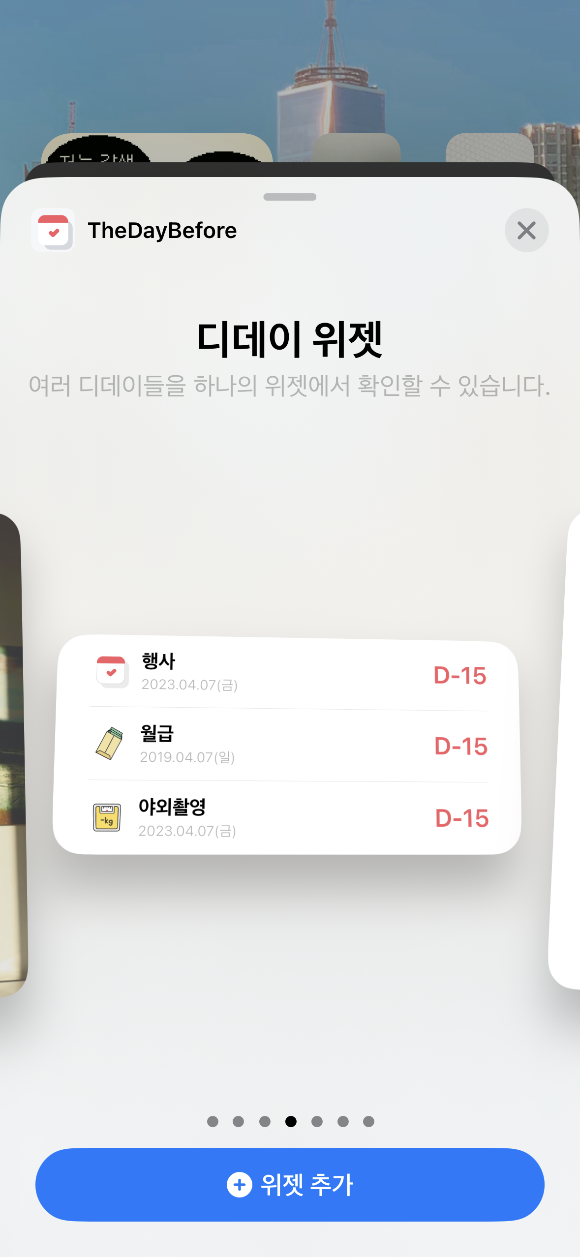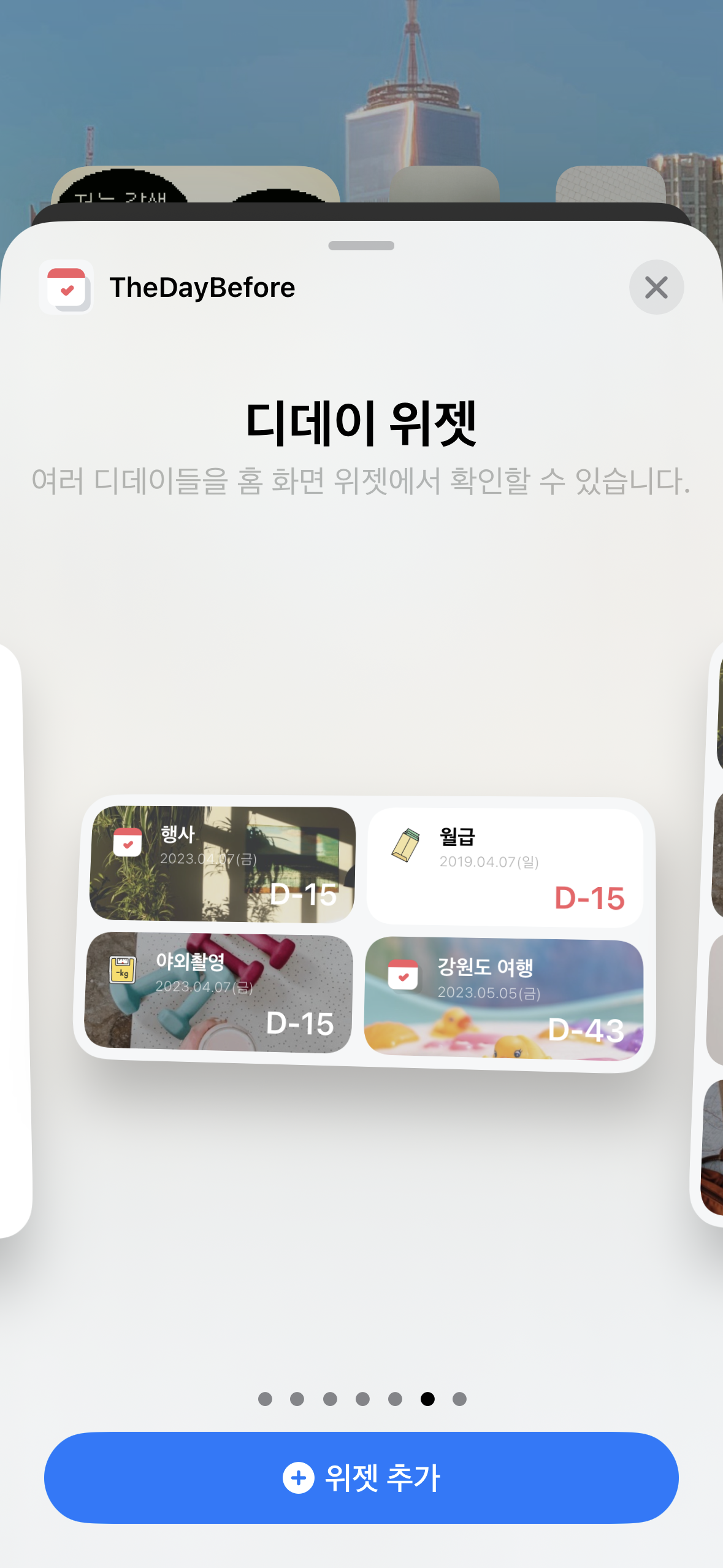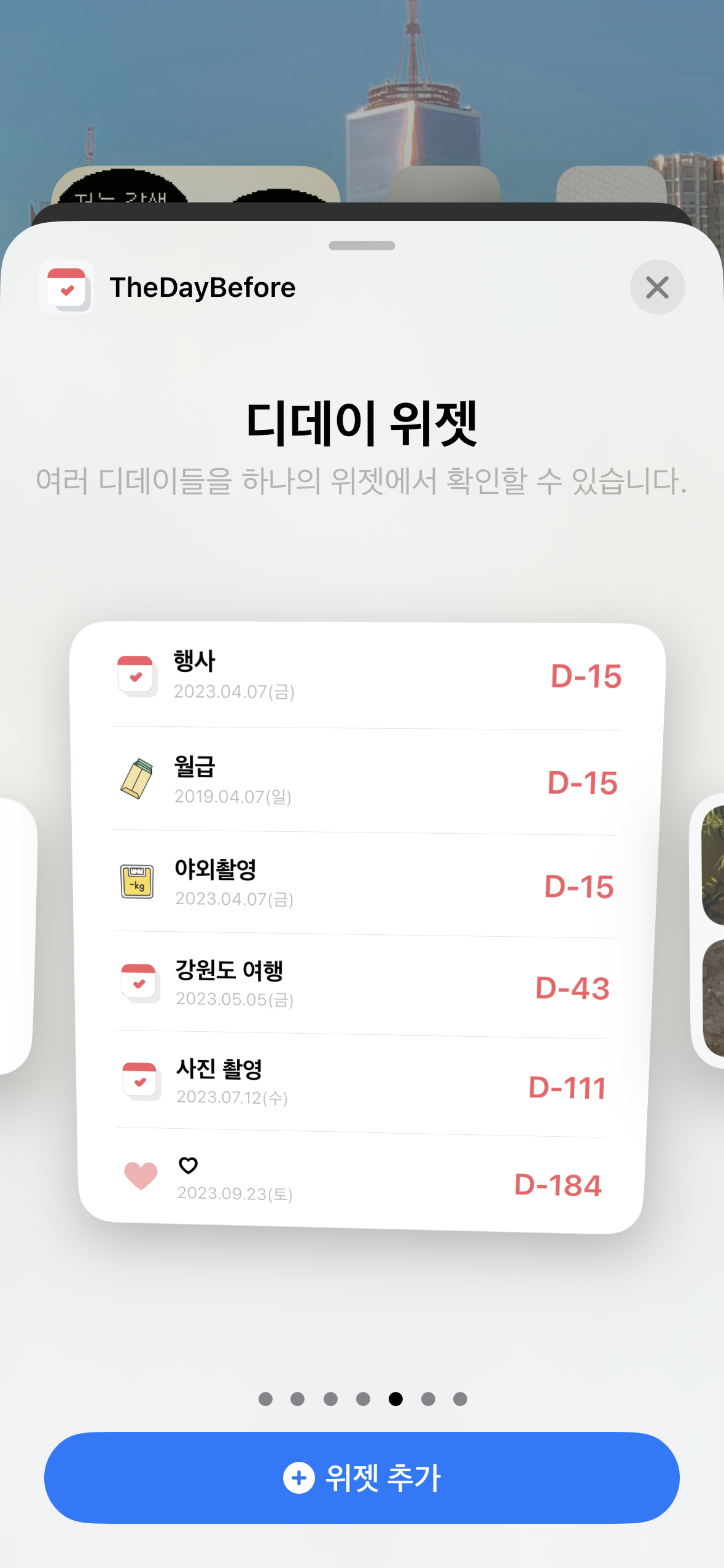 아래로 스크롤하여 TheDayBefore 위젯을 선택합니다. 사용자의 취향에 맞게 디데이 위젯 크기와 형태를 선택할 수 있습니다. 저는 디데이 리스트가 적힌 위젯을 선택했습니다. 아래 위젯추가를 눌러주면 위젯이 생성됩니다.
