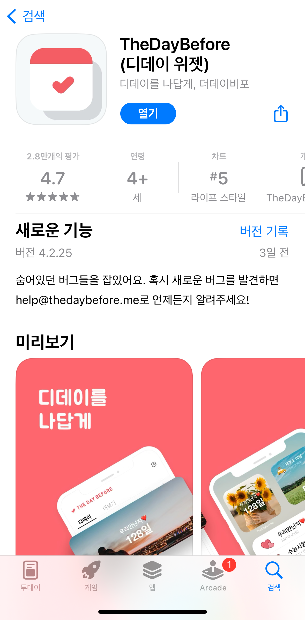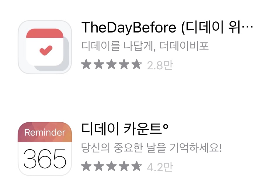 앱스토어에 “TheDayBefore(디데이 위젯)” 또는 “디데이 카운트” 앱을 다운로드합니다. 가장 유명한 앱은 TheDayBefore 입니다. 스티커나 사진 등을 마음대로 설정할 수 있기 때문입니다. 디데이 카운트 앱은 심플한 느낌입니다.