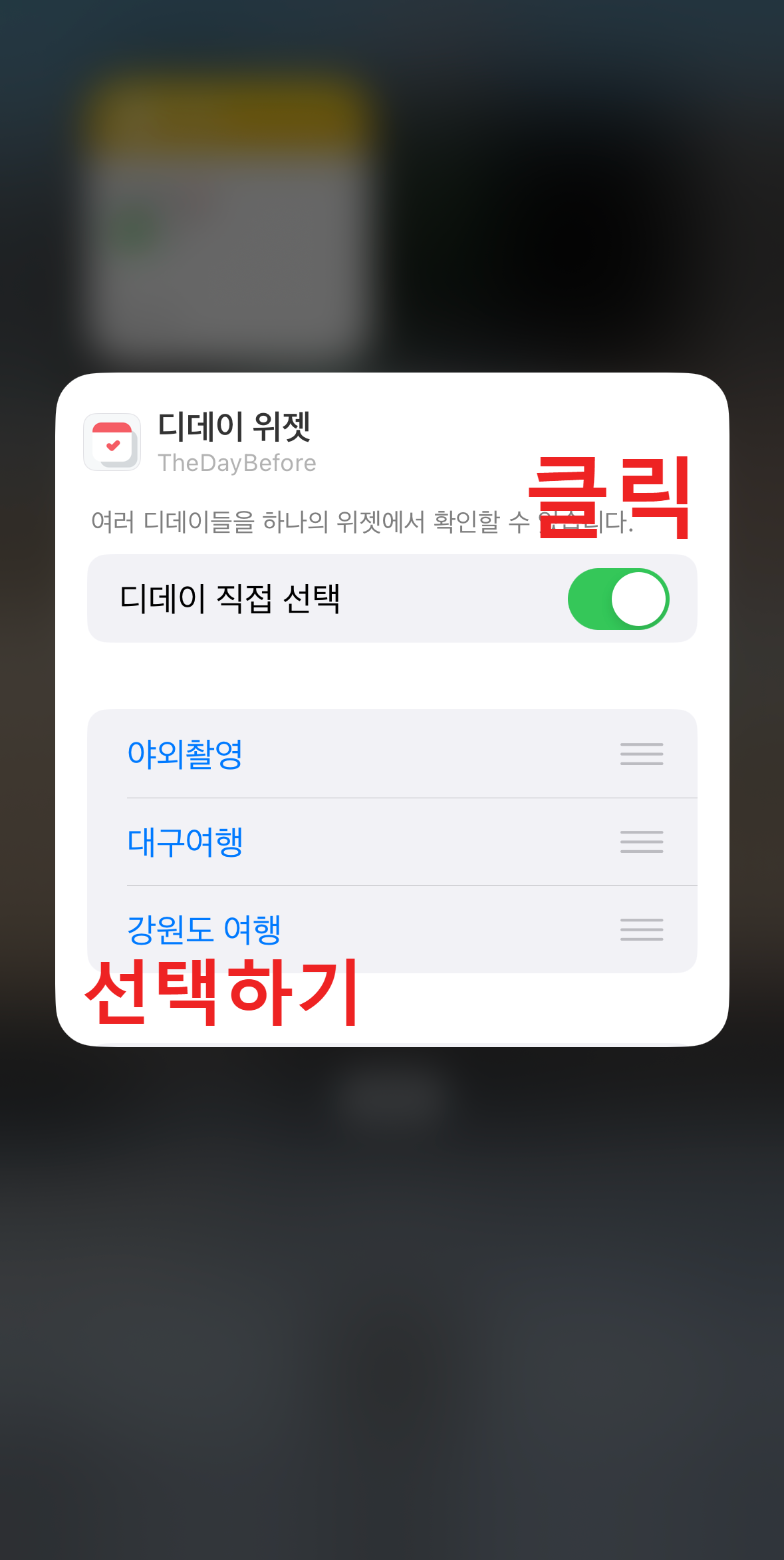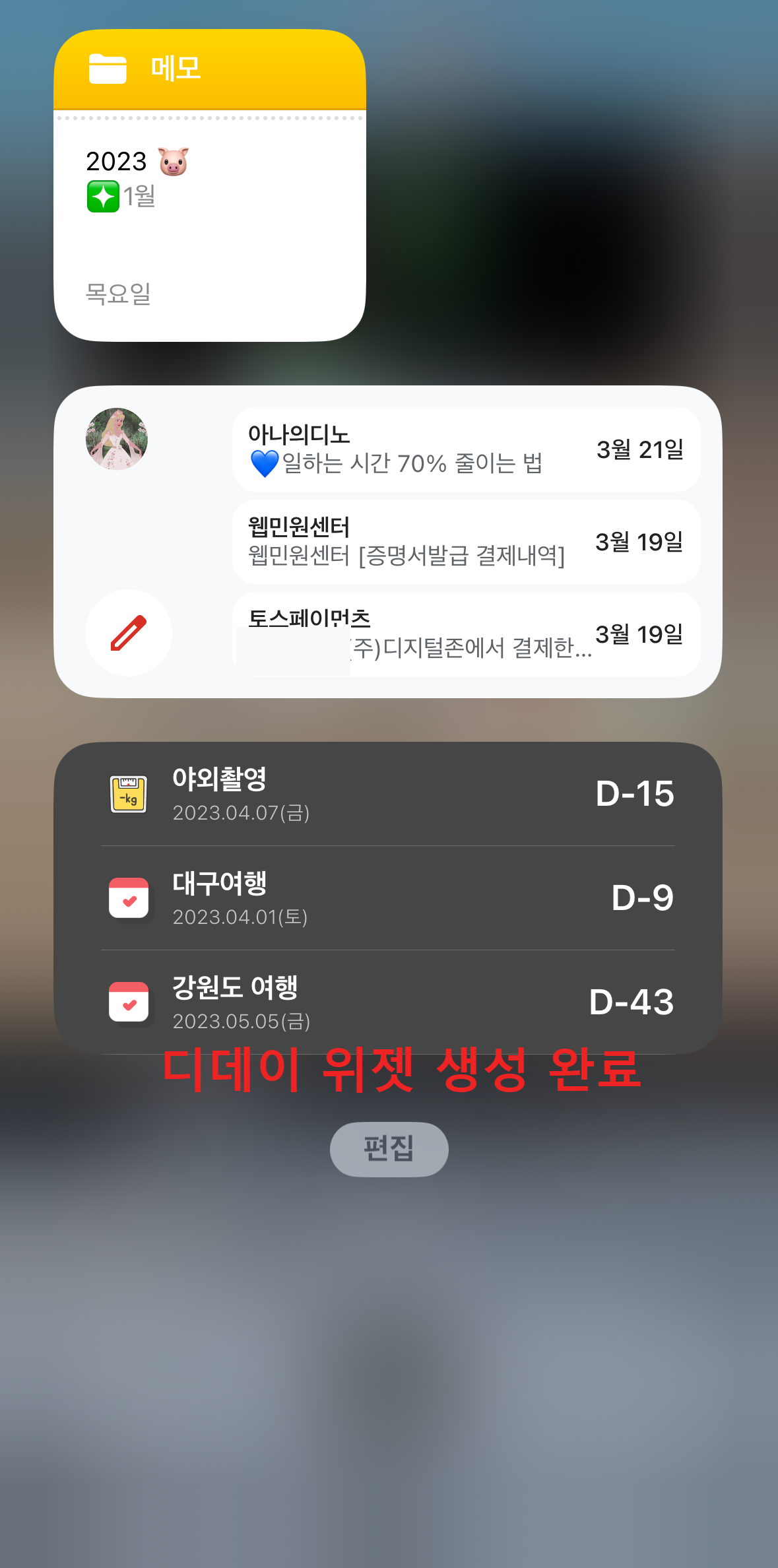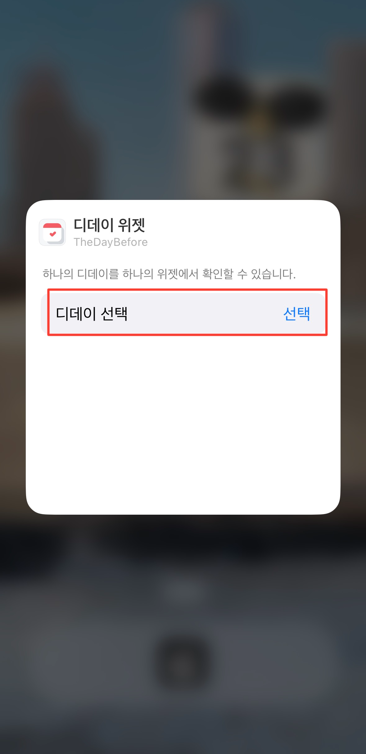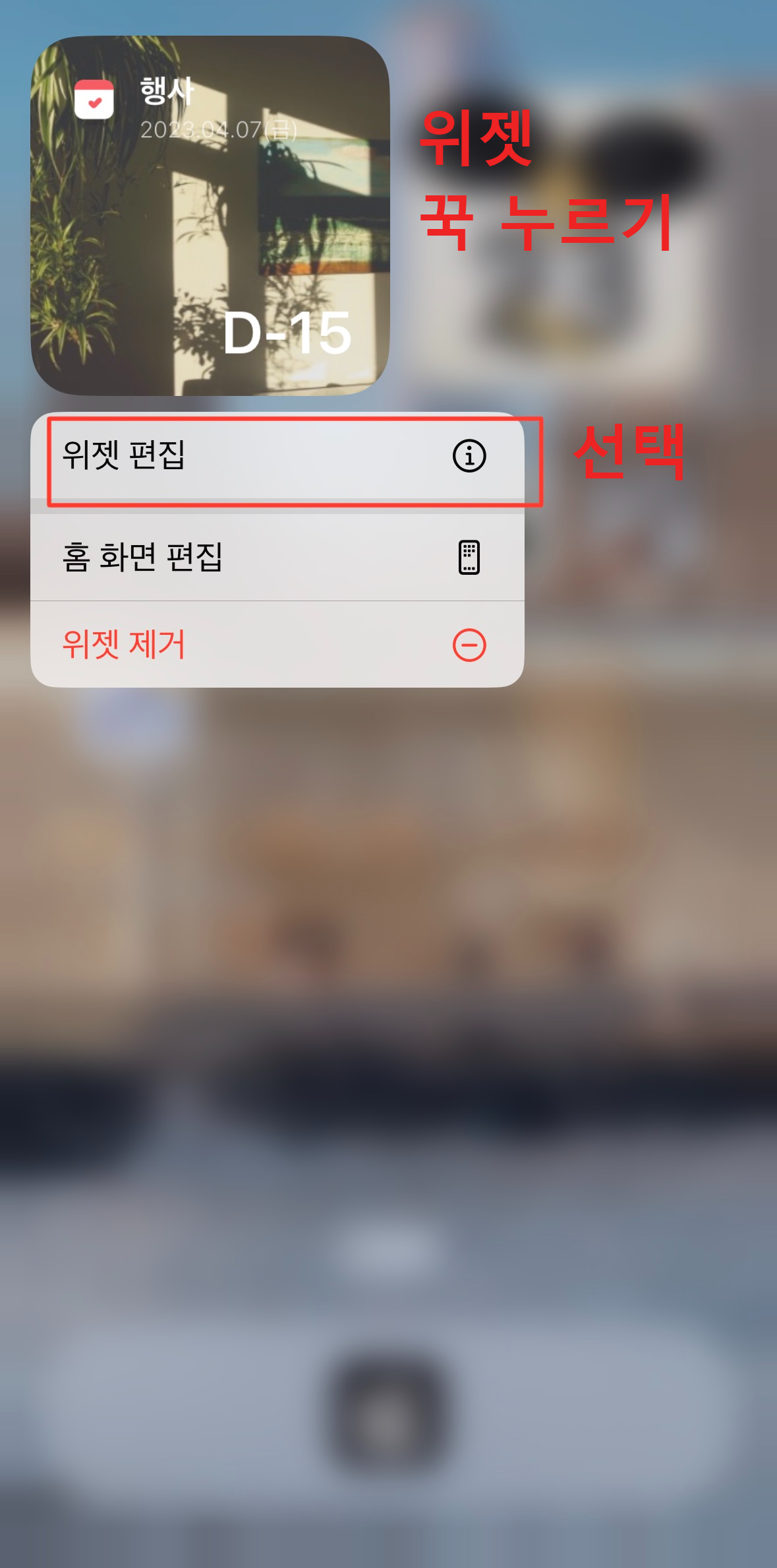 설치된 위젯에서 다른 디데이를 선택할 수 있습니다. 위젯을 꾹 누르고 “위젯 편집”으로 들어가서 “디데이 선택”을 클릭합니다.