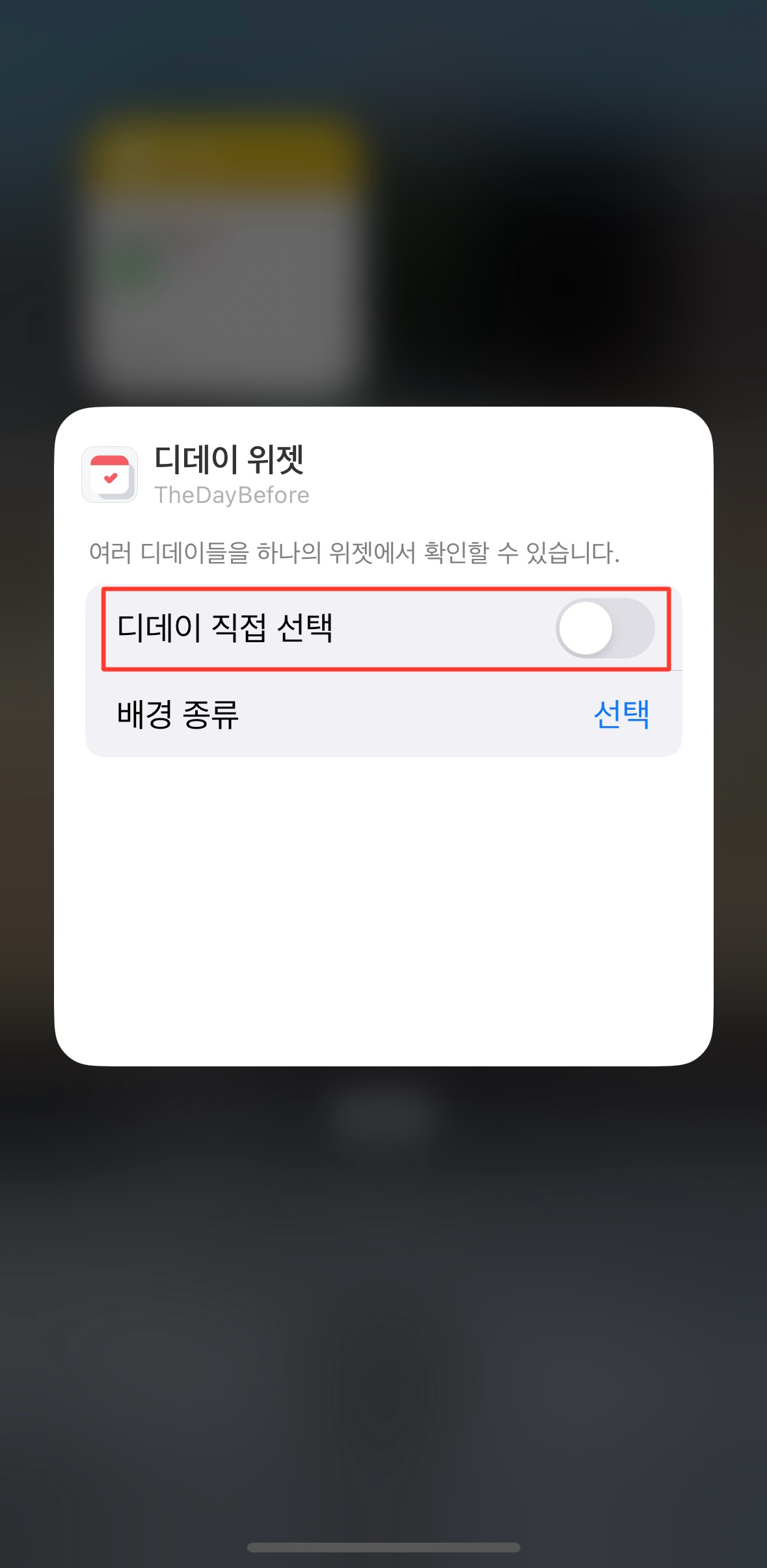 하나의 디데이를 선택할 경우 크기만 선택하면 됩니다. 하지만 디데이 리스트를 선택한 경우 원하는 디데이를 직접 선택할 수 있습니다. 디데이 위젯을 누르고 위젯 편집에 들어가서 디데이 위젯의 디데이를 직접 지정할 수 있습니다.