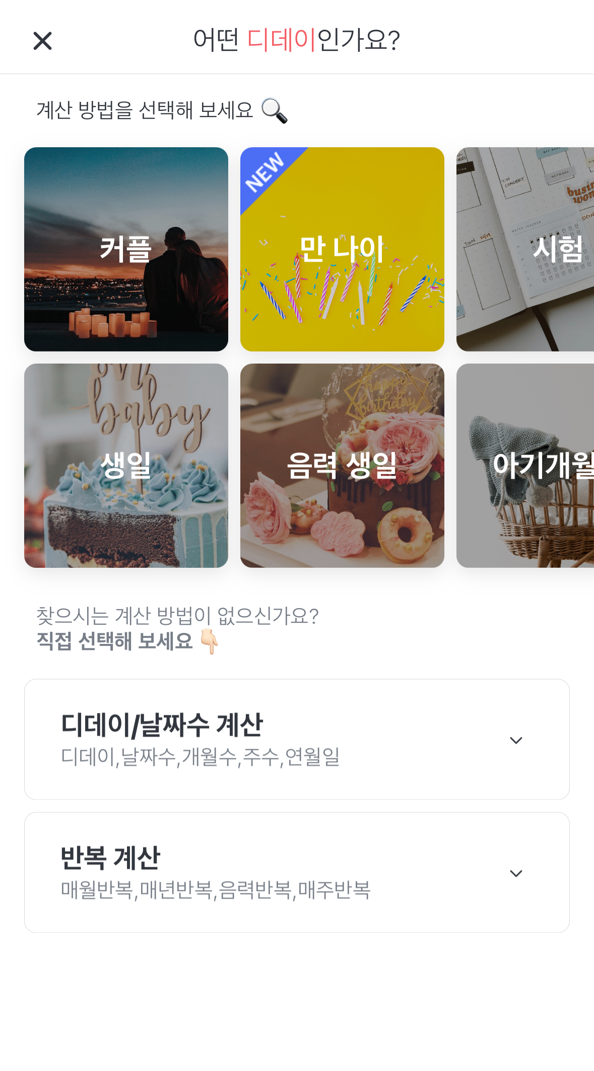 디데이/날짜수 계산은 시험이 얼마나 남았는지 알 수 있는 디데이, 커플기념일 사귄지 1일부터 시작하는 것을 기록하는 날짜수, 아기 성장 기록을 위한 개월수 등을 선택할 수 있습니다.