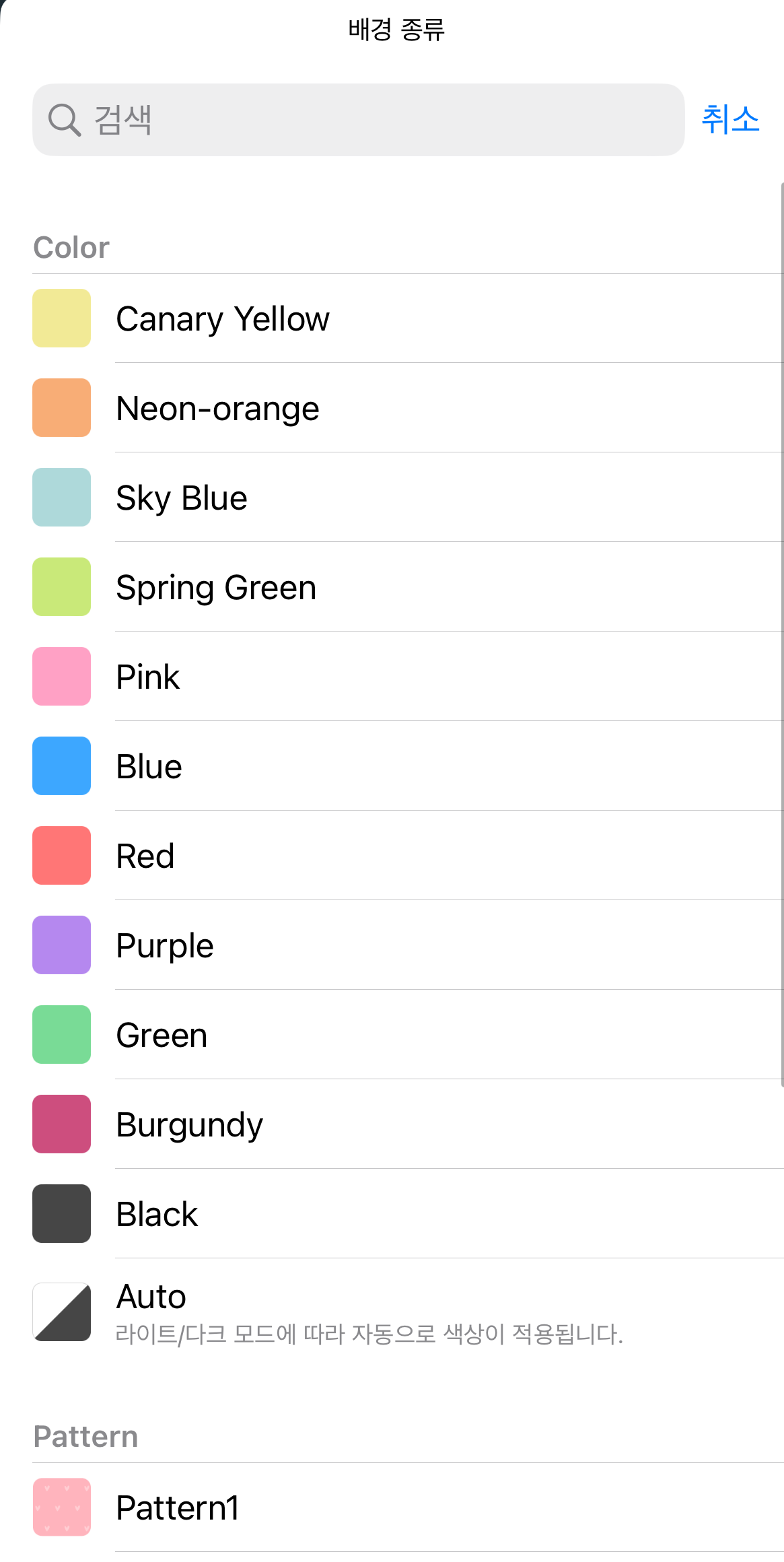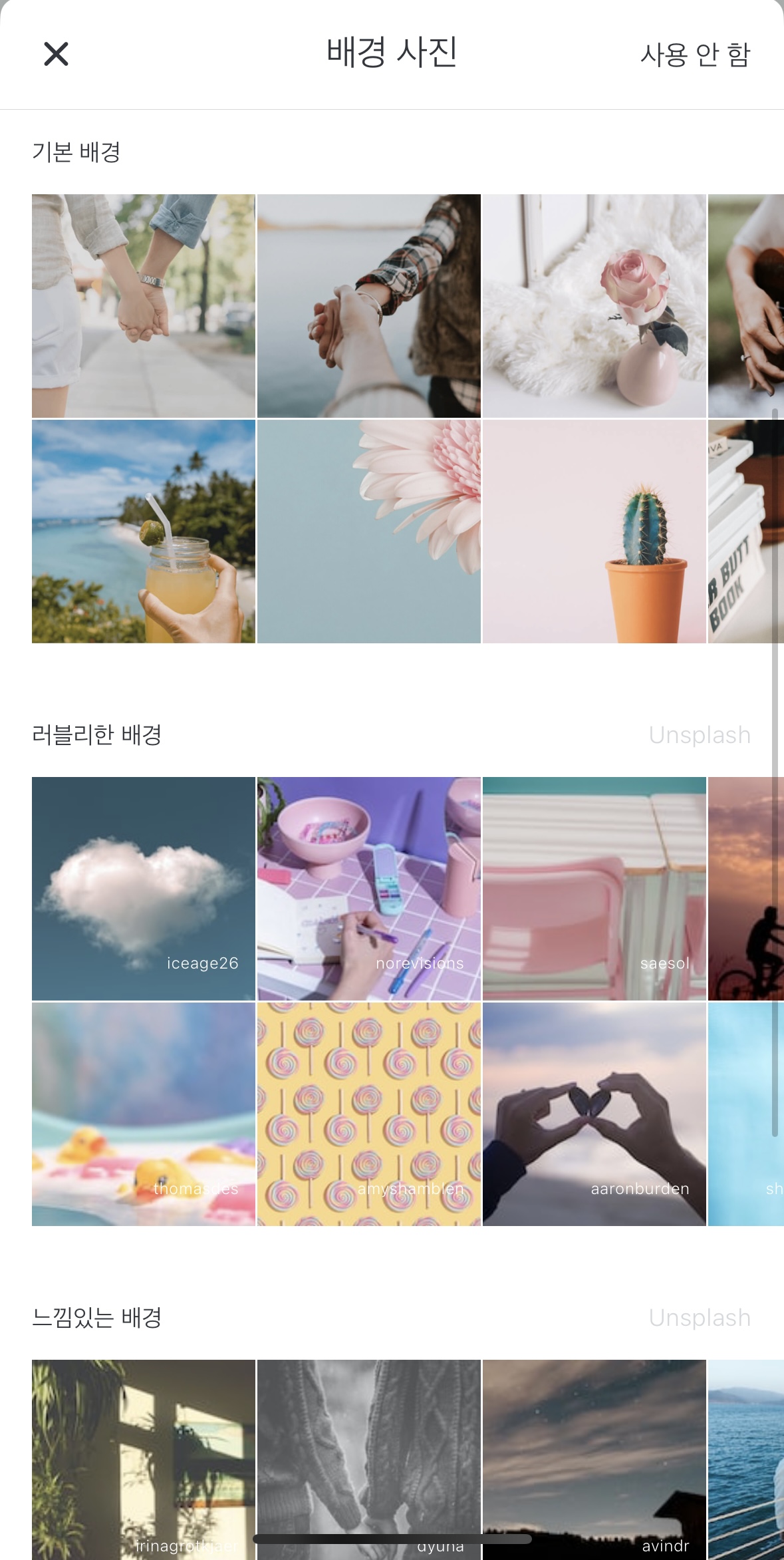 배경을 직접 설정할 수 있고 앱 내에 있는 배경으로 지정하여 사용할 수 있습니다.