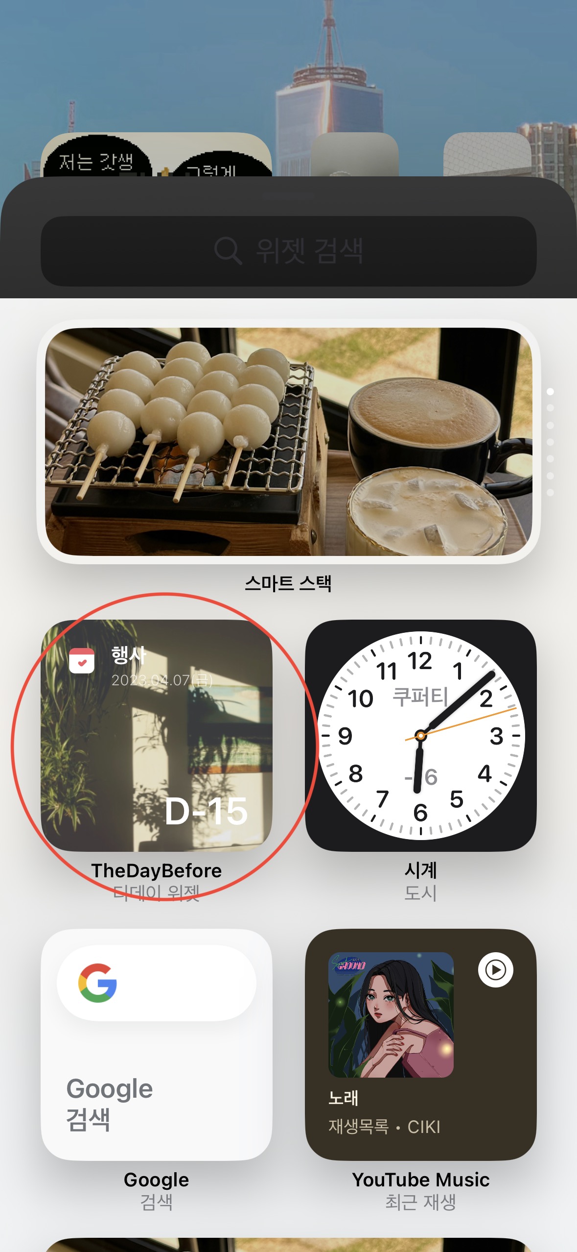 시계 화면 아래에 “위젯 추가”를 터치합니다. 그리고 아래로 스크롤하여 TheDayBefore 디데이 위젯을 선택합니다.