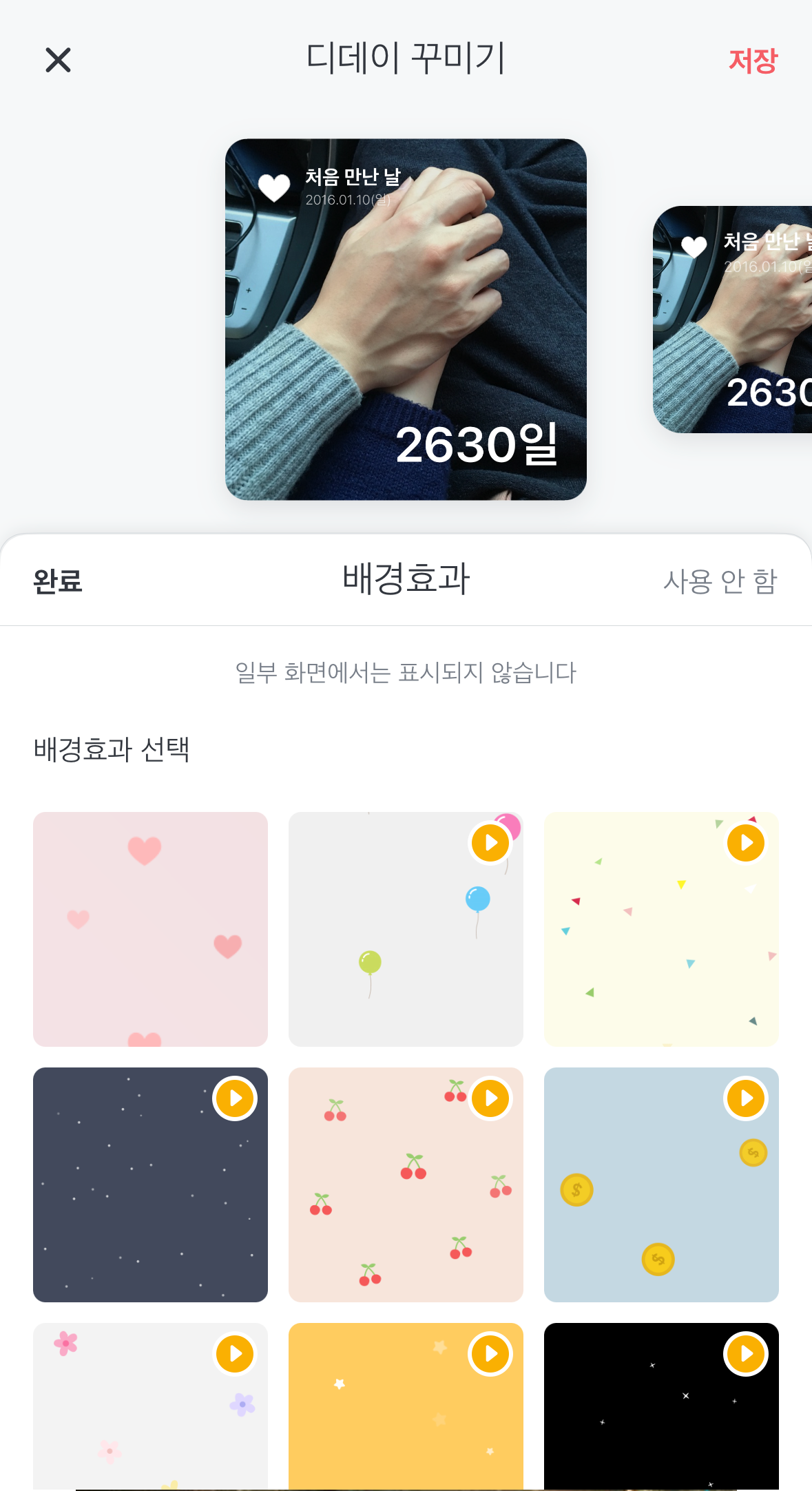 TheDayBefore에 가장 큰 장점! 꾸밀 수 있는 아이템이 정말 많다는 것입니다. 사진을 설정할 수도 있고 배경화면에 효과나 스티커를 설정할 수도 있습니다.
