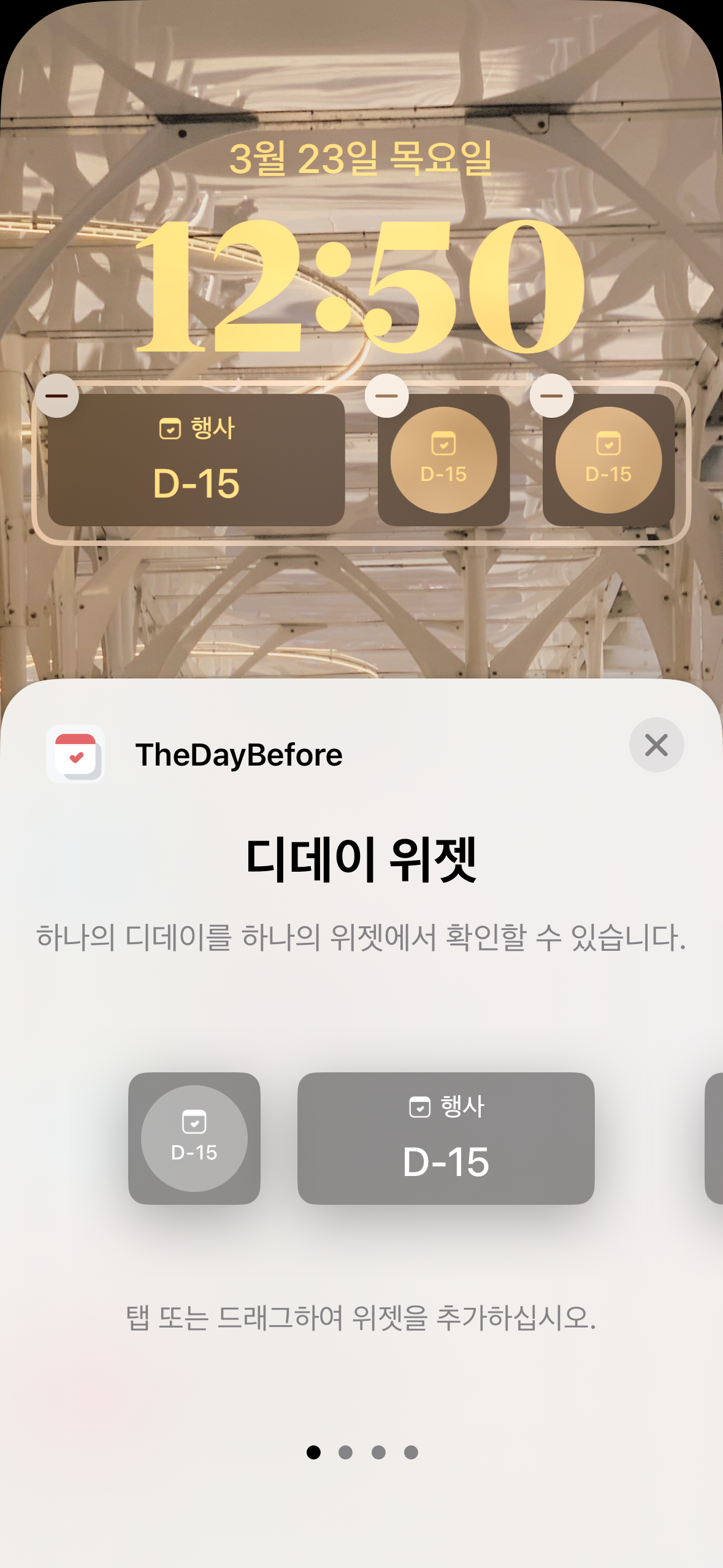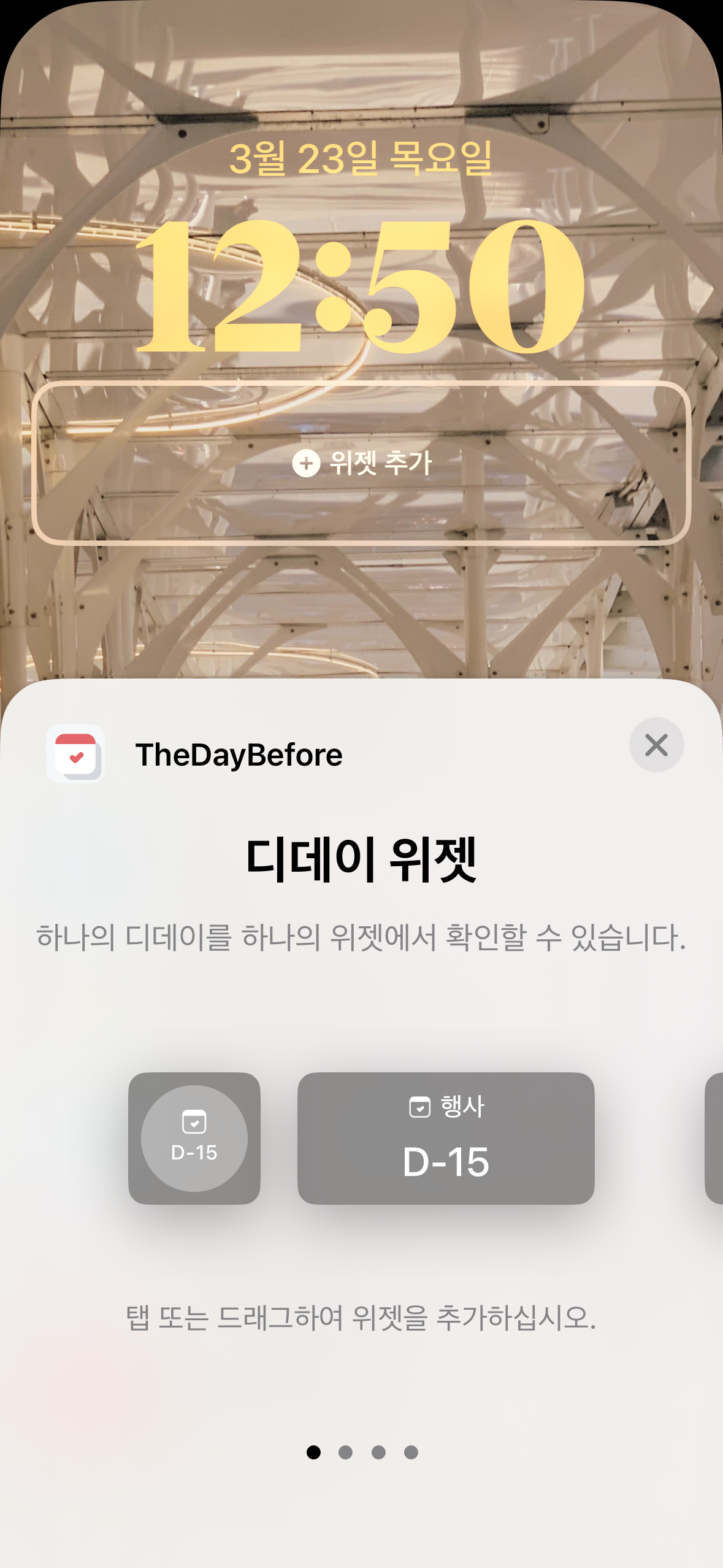잠금화면/홈화면에서 오른쪽으로만 쓸어넘기면 디데이를 확인할 수 있는 위젯을 설정하였습니다.