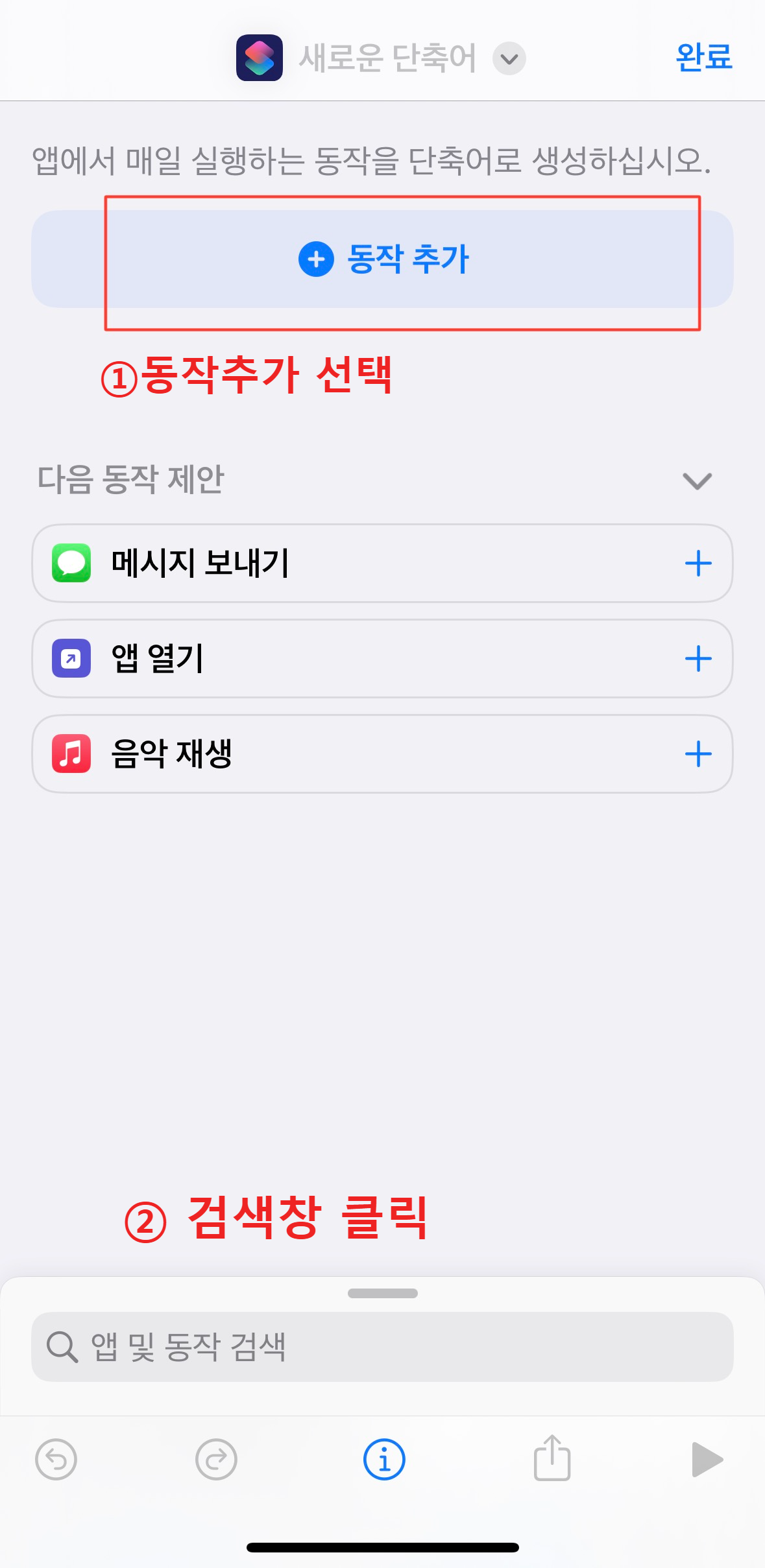 새로운 단축어를 만들어 줄 예정입니다. [동작 추가]를 선택합니다.
