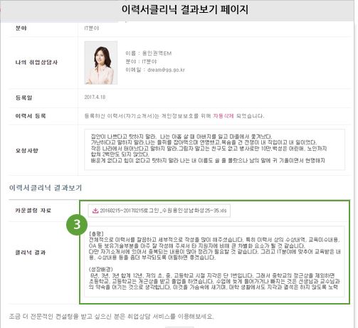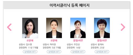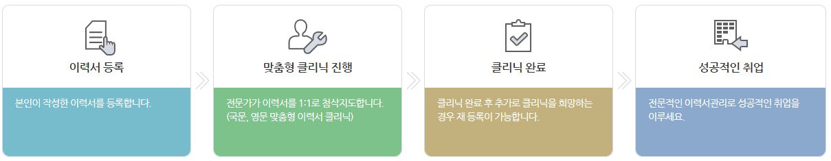 이력서는 국문, 영문 맞춤형으로 진행되며 클리닉이 완료시 결과를 확인할 수 있습니다. 추가로 클리닉을 희망하는 경우에 재등록이 가능합니다.