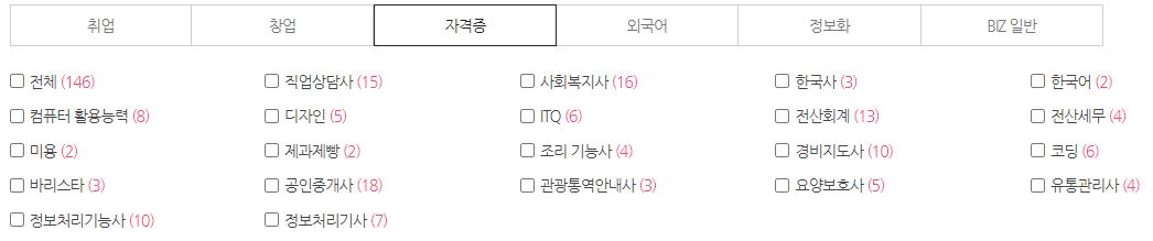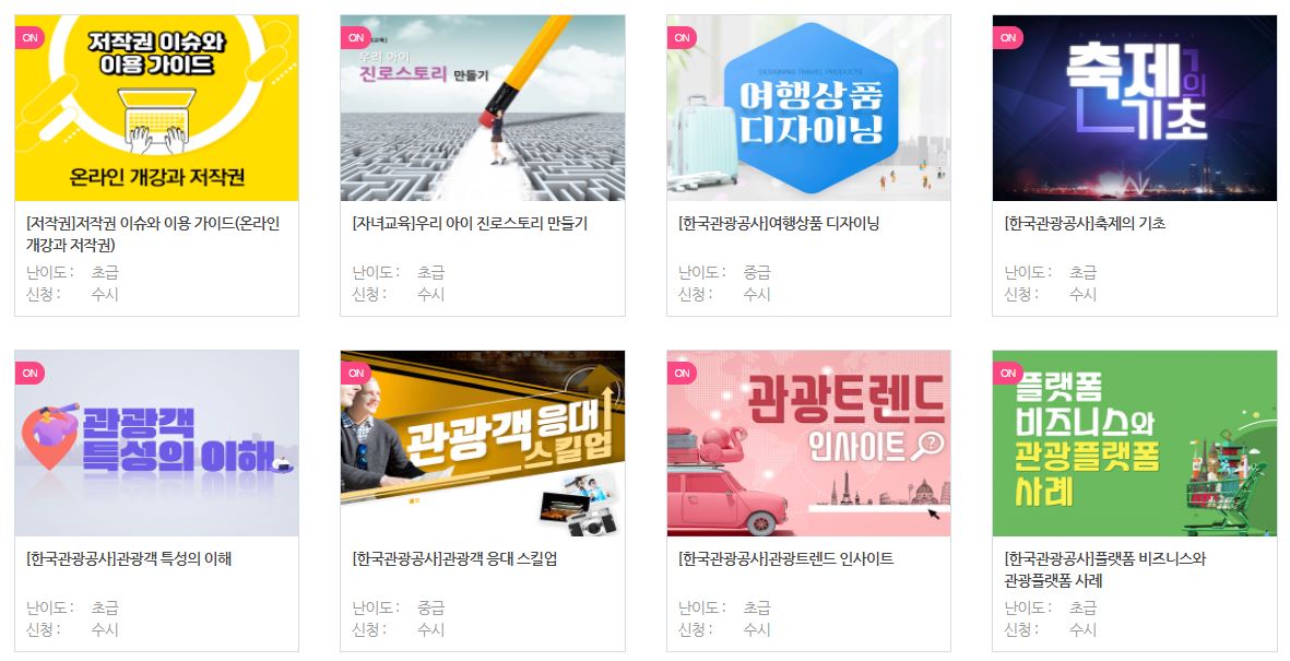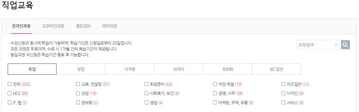여성유망직업, 직업스킬 업그레이드, 창업준비, 취업준비, 외국어, 자격증, 정보화 등 약 700개가 넘는 과목을 보유하고 있습니다.