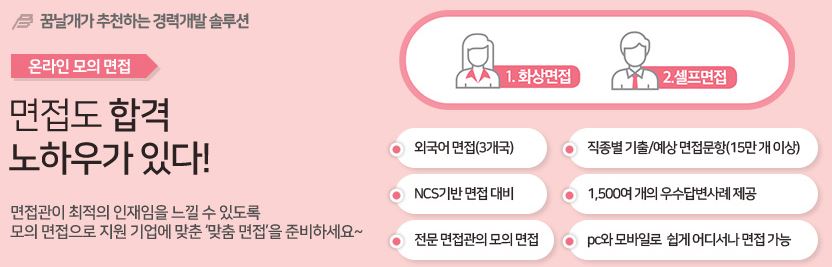 화상면접, 셀프면접(피드백), AI모의면접(피드백) 등 다양한 방식의 모의면접이 가능하며 인성 및 역량면접, 외국어 면접, NCS기반 면접등의 다양한 유형의 모의 면접이 가능합니다. 면접 자료 및 사례 제공은 직종별 기출/예상 면접문항 15만개 이상 제공이 가능하며 1,500개 우수답변사례도 제공됩니다.