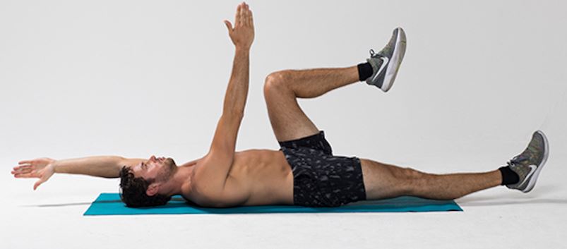 1. 천장을 보고 바로 누워서 양 팔을 앞으로 쭉 뻗습니다. 이때 허리는 바닥에 딱 붙이고 다리는 들어올려 무릎을 직각으로 구부립니다.