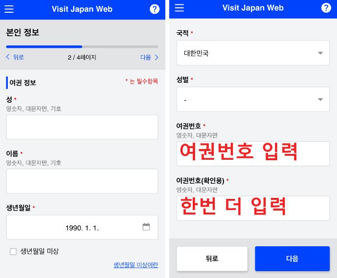 ③번칸에는 사용자의 정보를 입력합니다 (이름, 여권번호, 생년월일)