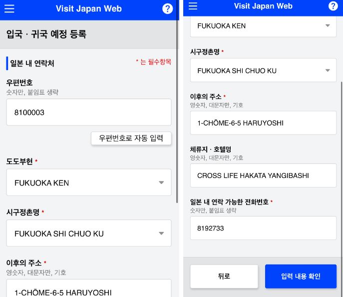 일본에서 묵는 호텔 우편번호를 넣고 자동입력을 누르면 도도부현, 시구정촌명은 입력이 자동으로 됩니다. 이후의 주소는 위에서 작성하셨듯이 동일하게 입력합니다. 전화번호는 일본 체류하는 호텔 전화번호로 기입하였습니다.