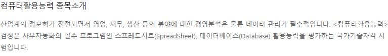 - 특징 : 바짝 공부하면 금세 딸 수 있는 자격증으로 독학하기 비교적 쉬운 편입니다.