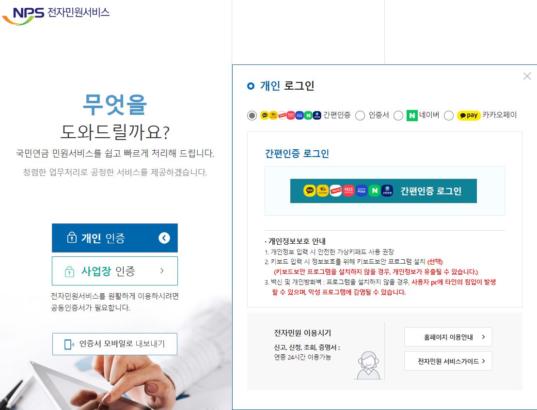 개인인증/사업자 인증을 클릭하여 로그인 인증 절차를 합니다. 인증서로그인, 네이버 인증 로그인, 카카오페이 로그인 등을 사용자가 원하는 방법을 이용하여 간편 인증으로 로그인을 합니다. 이를 이용하면 별도로 국민연금공단 홈페이지에 회원가입을 하지 않아도 됩니다.