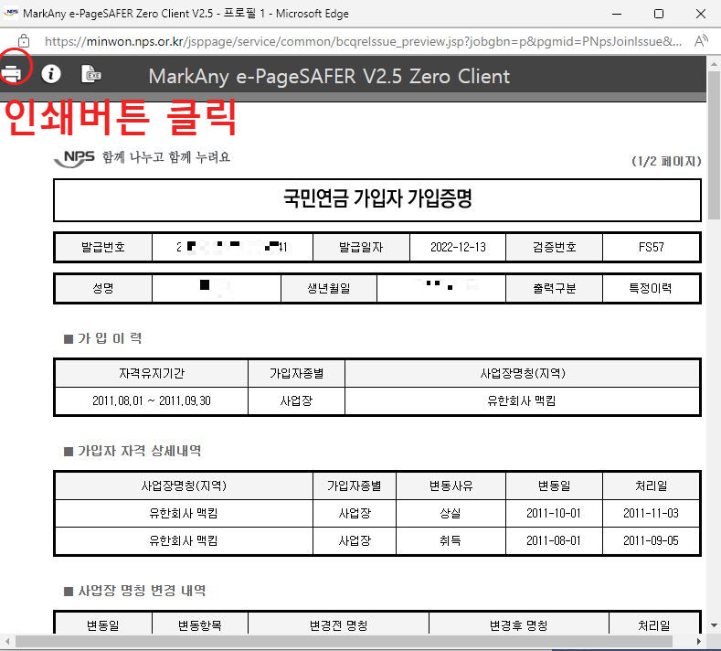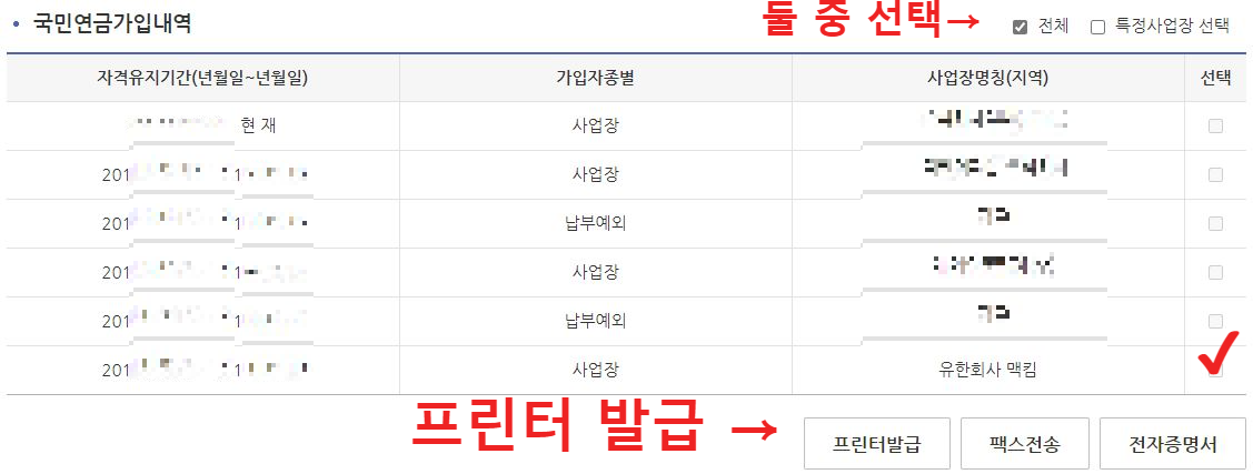국민연금가입내역에서 자신의 가입내역을 확인할 수 있습니다. 상단에 [전체] 발급할 것인지, [특정 사업장]을 선택할 것인지 체크할 수 있습니다. 아래 [프린터 발급], [팩스 전송], [전자증명서] 중에서 편리한 방법으로 선택하여 증명서를 발급할 수 있습니다.