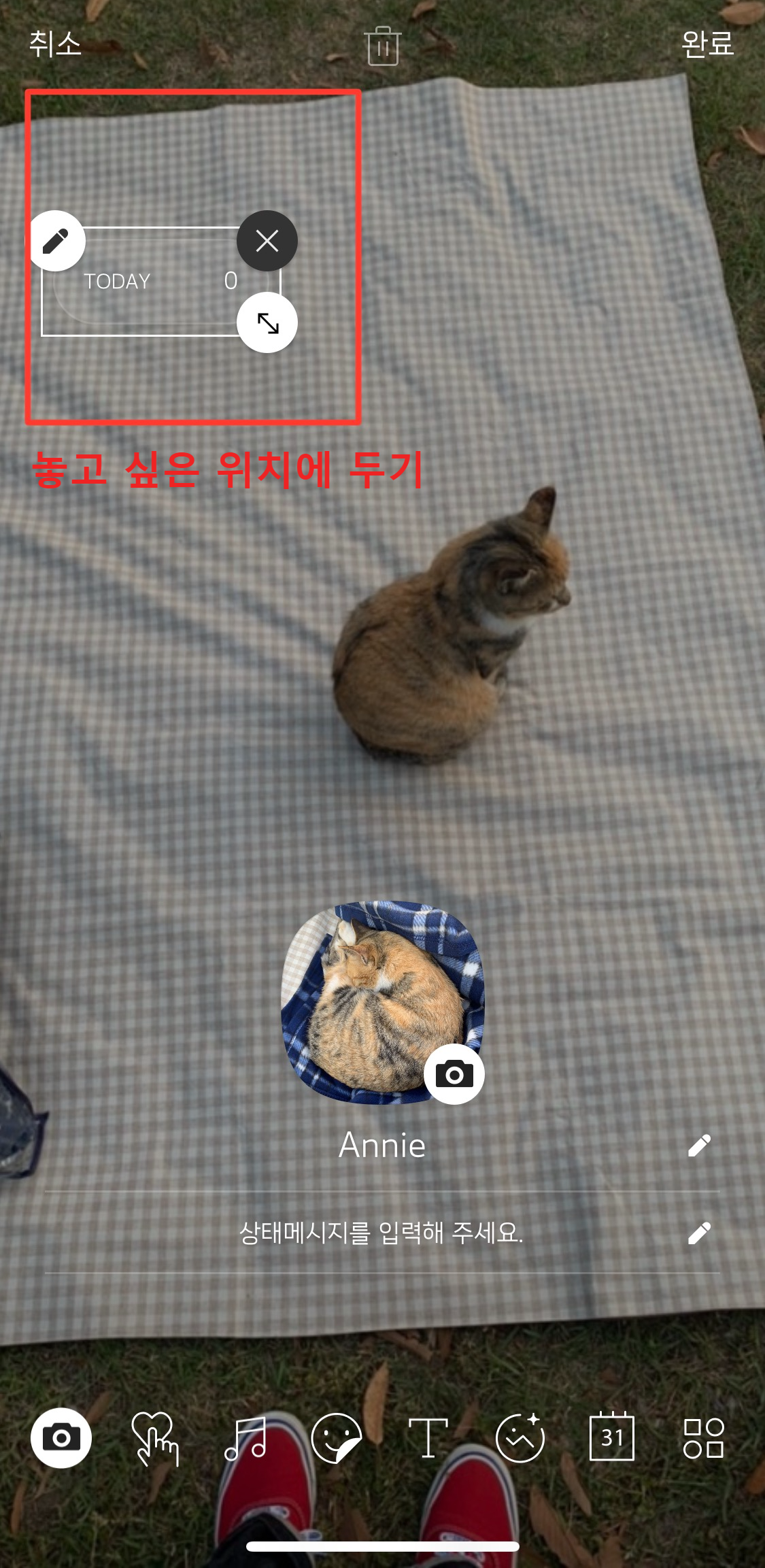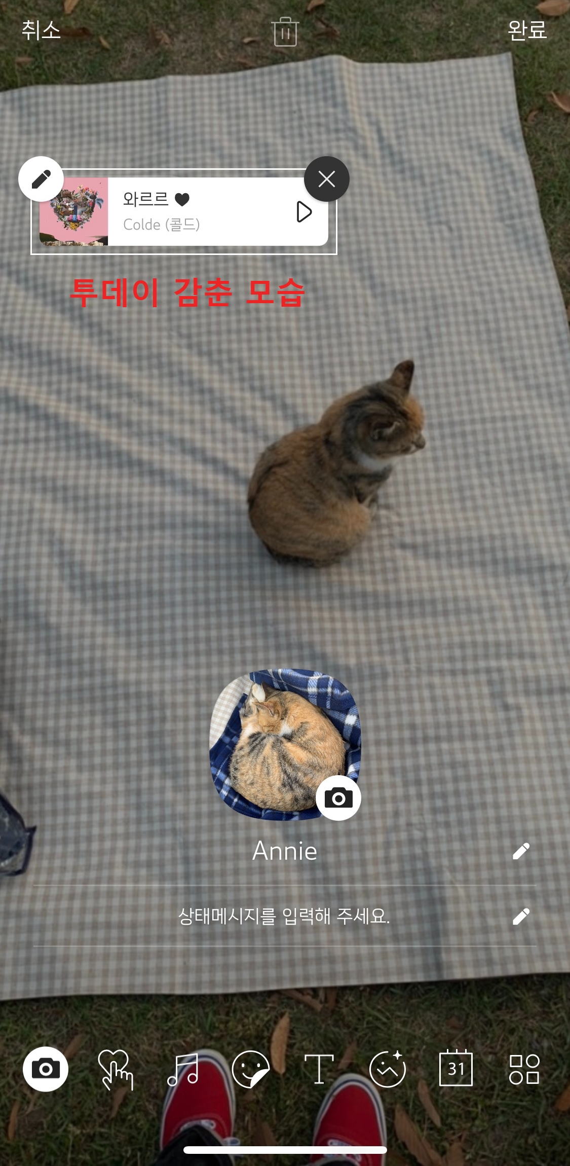 만약 투데이 위젯을 감추고 싶으면 아래 뮤직을 선택하여 나의 프로필 뮤직 위젯으로 투데이를 감출 수 있습니다. 원하는 위치에 놓고 완료 버튼을 클릭합니다.