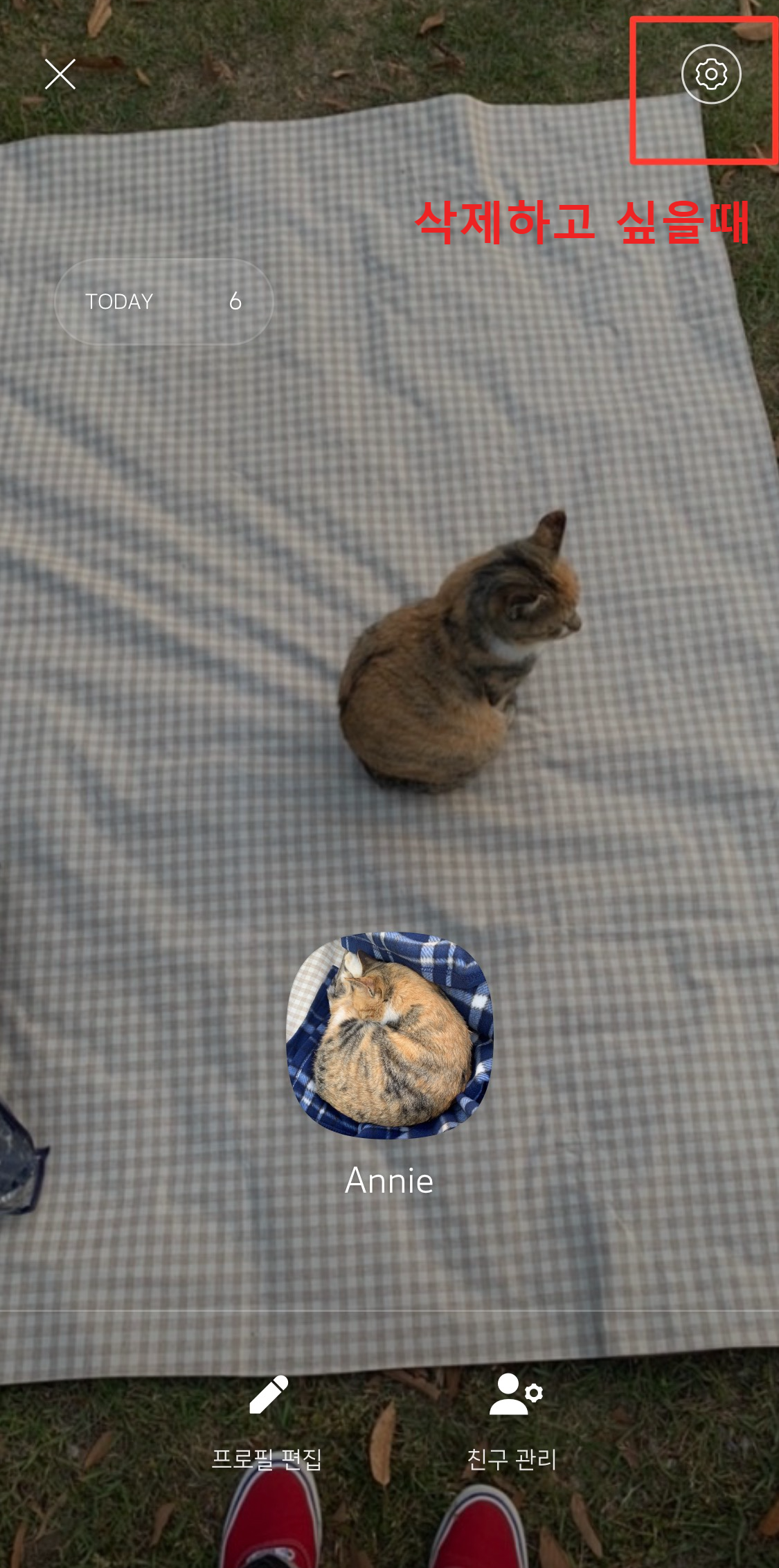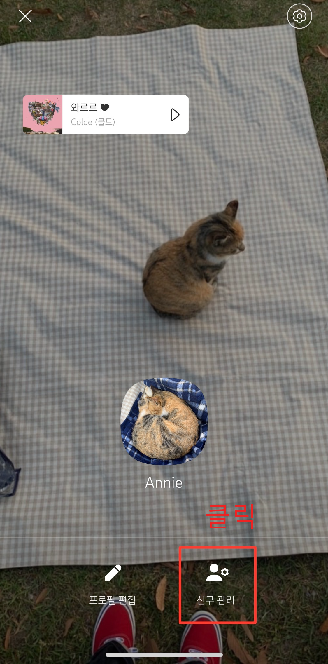 프로필을 눌러 사진을 변경할 수 있고, 배경사진은 프로필 하단 왼쪽 카메라 표시를 눌러 프로필 배경을 앨범에서 선택할 수 있습니다.