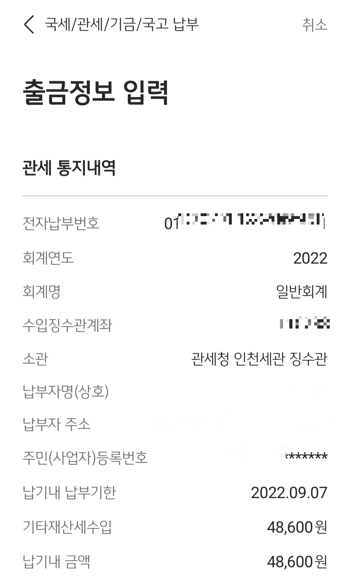 공과세 내기 ▶ 관세 ▶ 전자납부번호 입력 ▶ 출금할 계좌확인 ▶ 완료